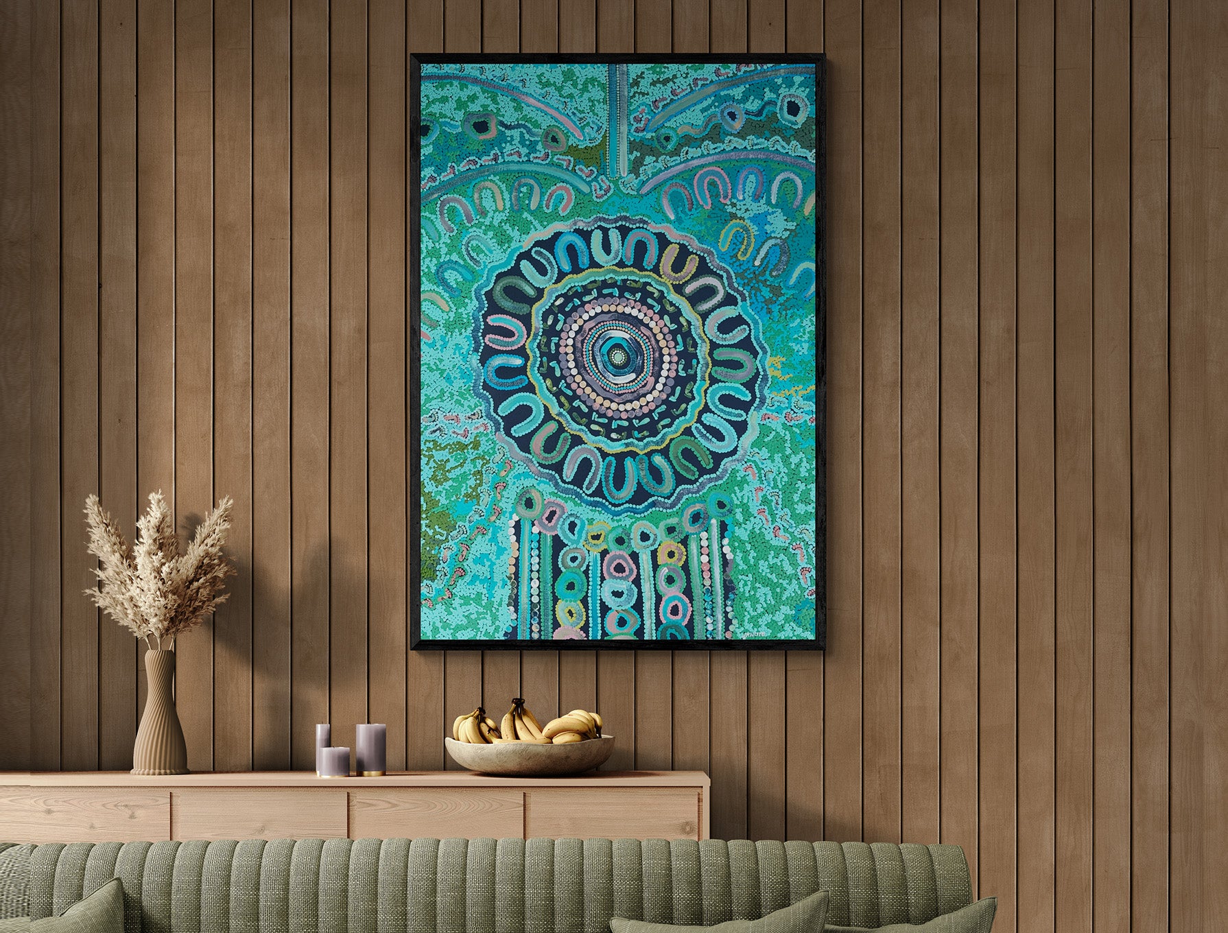 This piece celebrates connection, care, and healing, reflecting the deep relationship between people and the land. Vibrant turquoise and green tones, dot work, and circular motifs convey the importance of protecting Country and nurturing community.