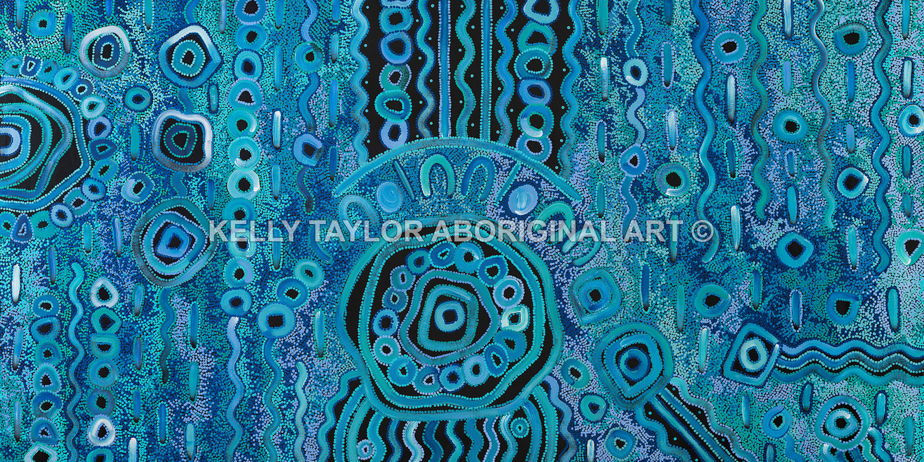 Blue Rain symbolises the spiritual gift of water, replenishing creeks, lakes, rock holes, plants, and animals, while celebrating family, resilience, and the beauty of Aboriginal culture. Kelly’s vibrant composition uses expressive dot work and bold colours to evoke connection, storytelling, and the power of nature.