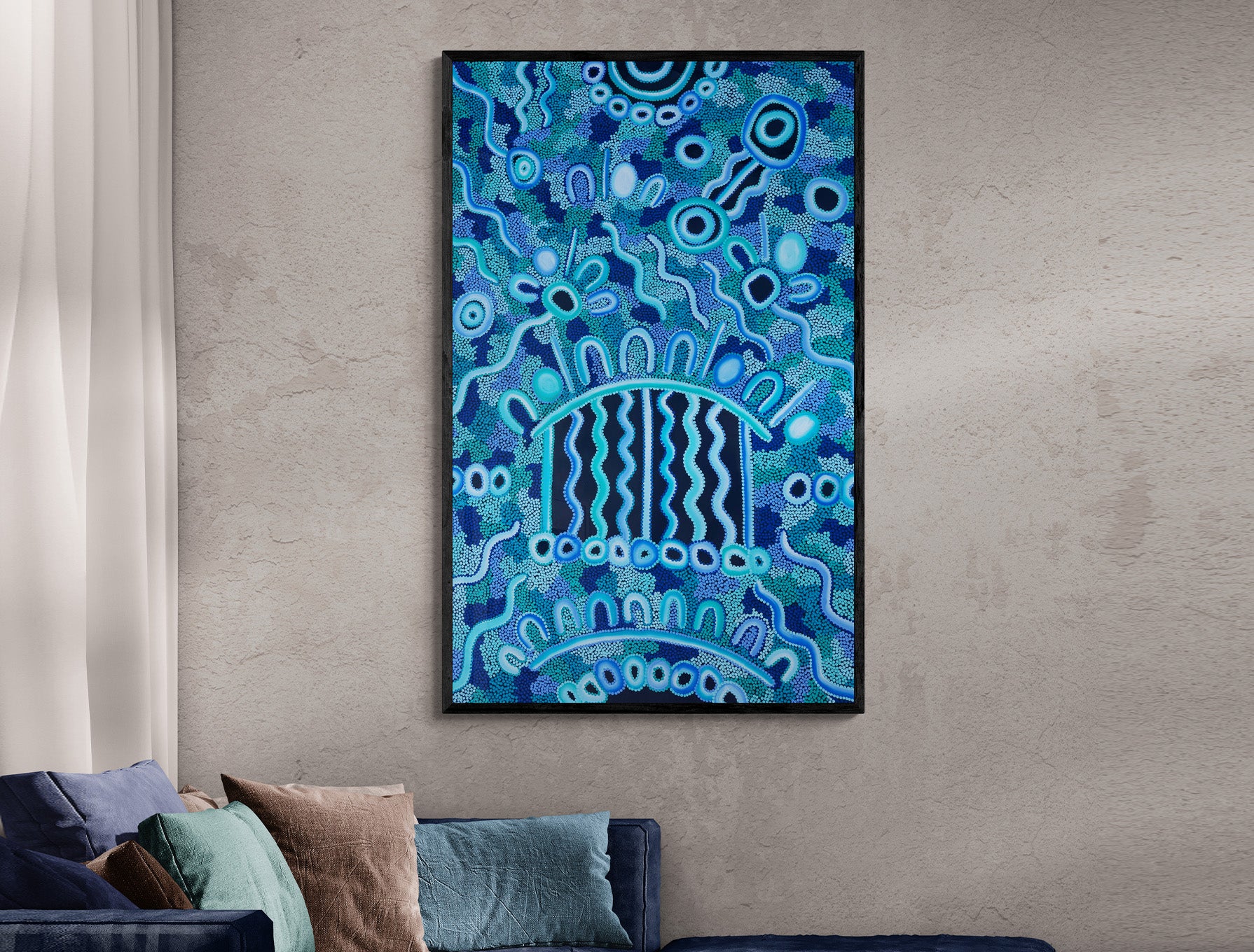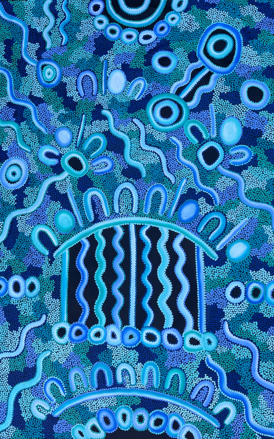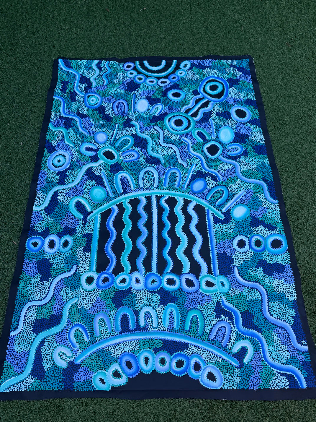 Reflecting intergenerational storytelling, this artwork celebrates the sacred cycle of knowledge passed from Elders to the next generation. Rich colours, dot work, and symbolic motifs convey culture, connection, and learning on Country.