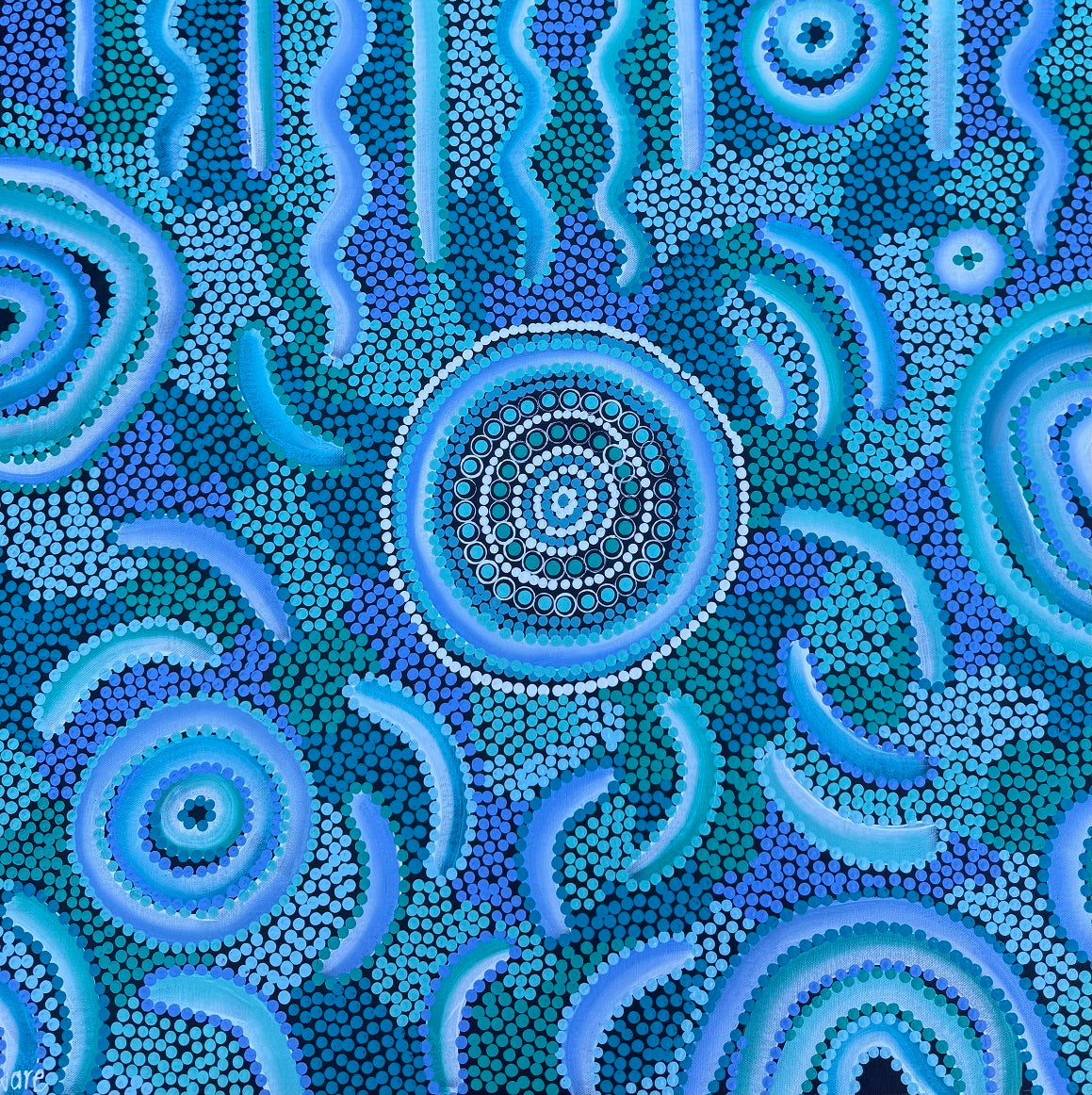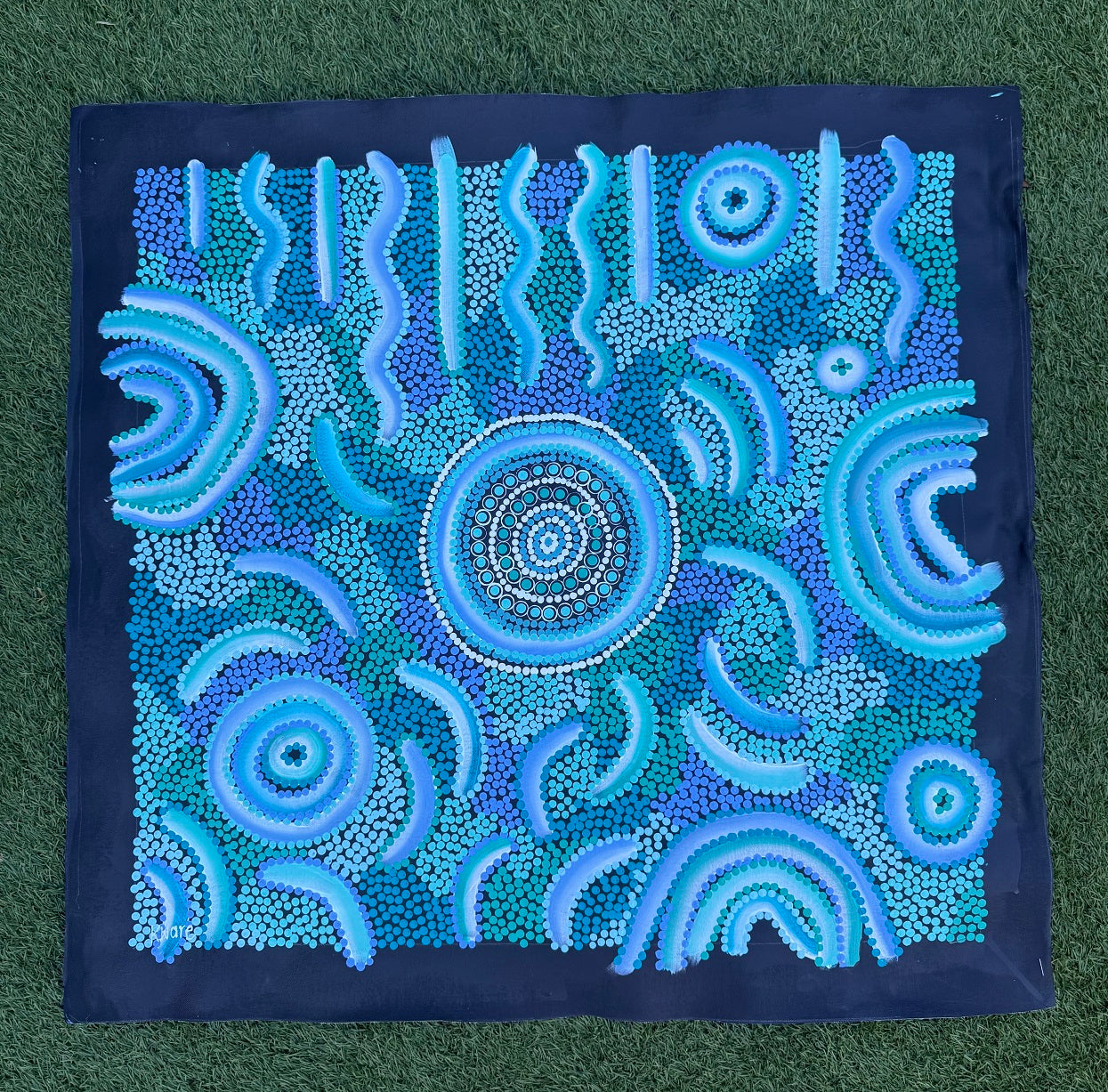 This artwork captures the peace and connection of camping under the stars, reflecting the sacred relationship between people, land, and the stories shared around campfires. Rich blues, purples, and warm earth tones bring Kelilah’s heritage to life on canvas.