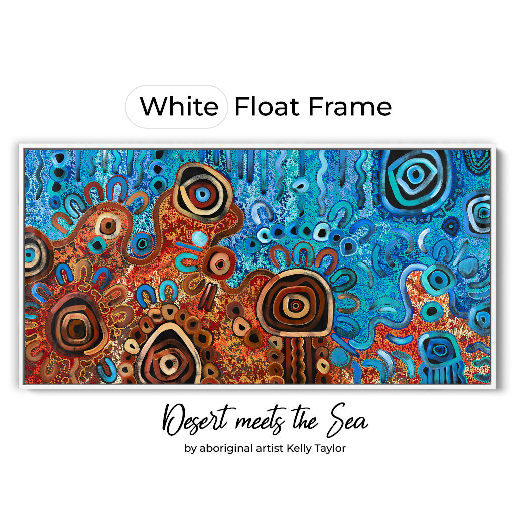 Desert Meets the Sea is a powerful Aboriginal art print by Yankunytjatjara/Kokatha artist Kelly Taylor. This reproduction canvas print tells the love story of Kelly, a desert girl, and her partner, a Wirangu/Narungga man from the sea.