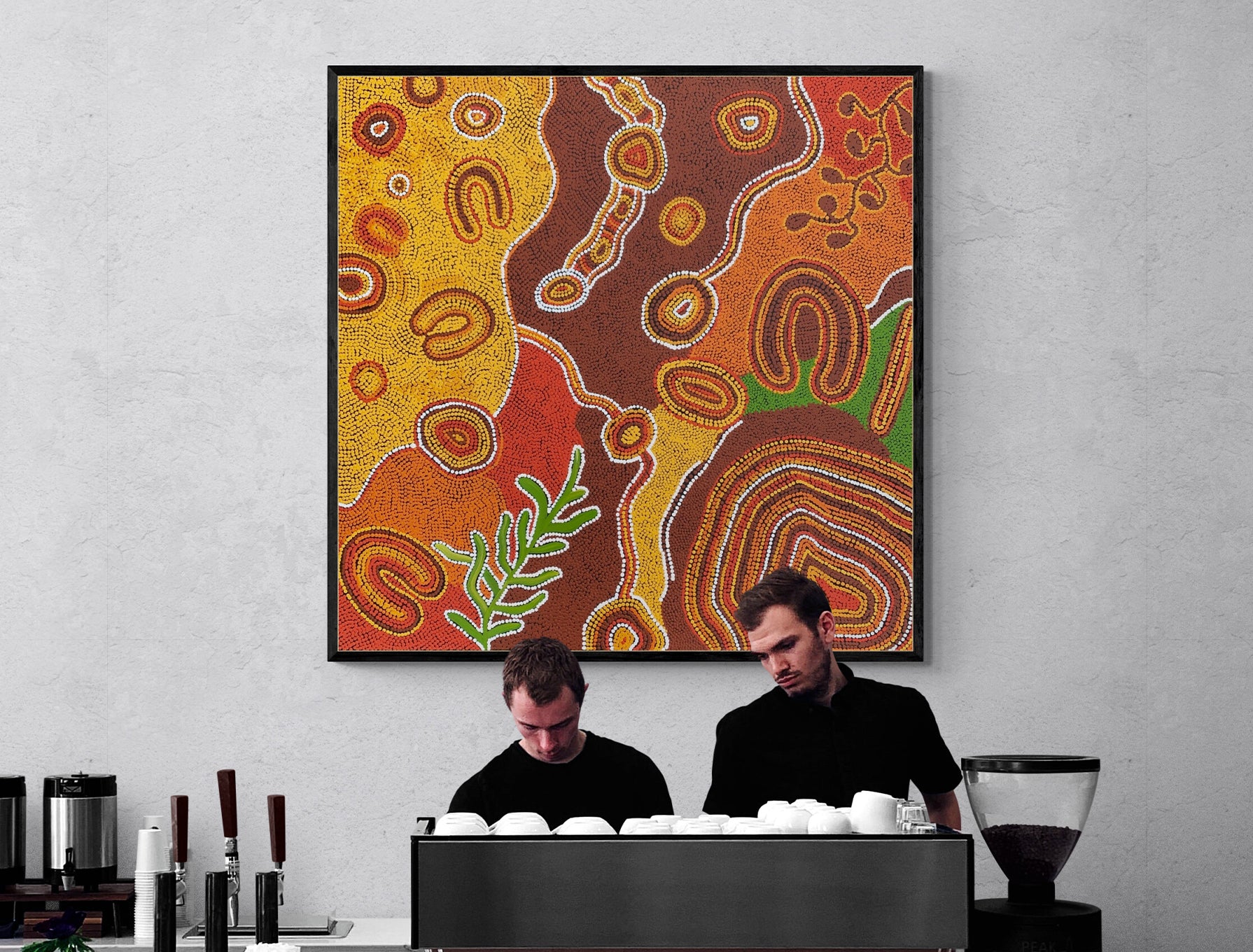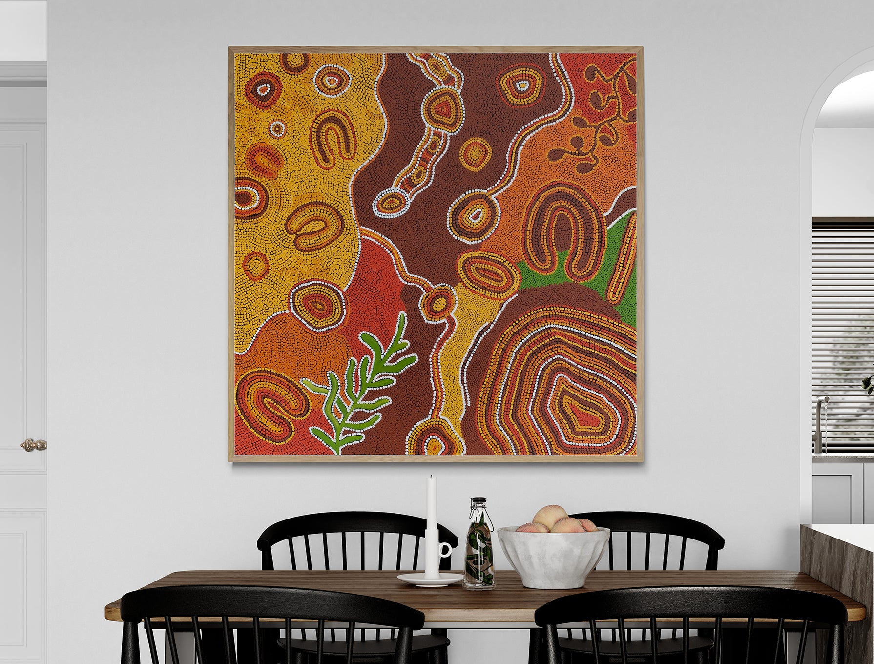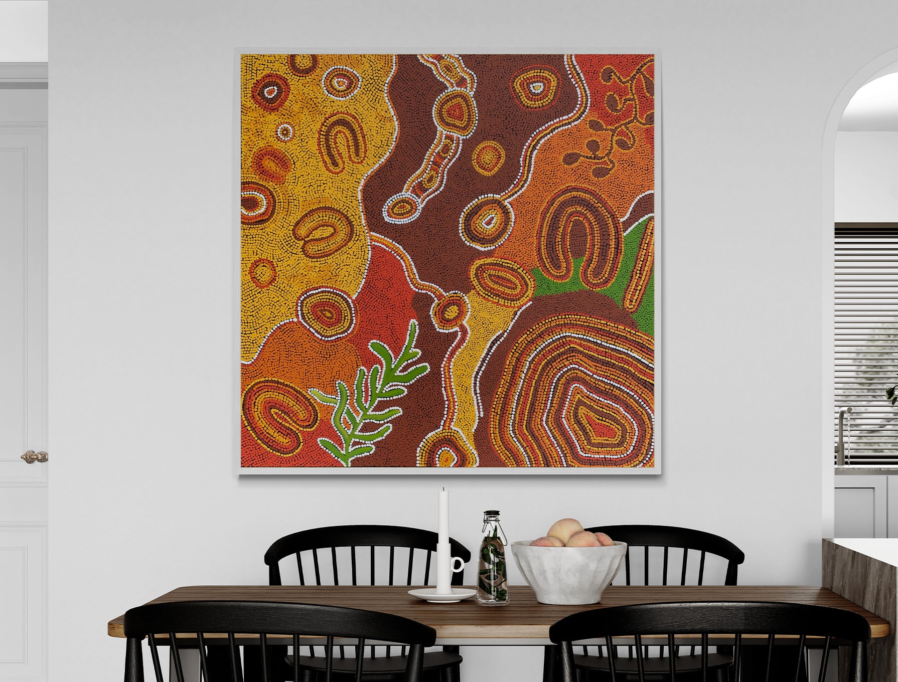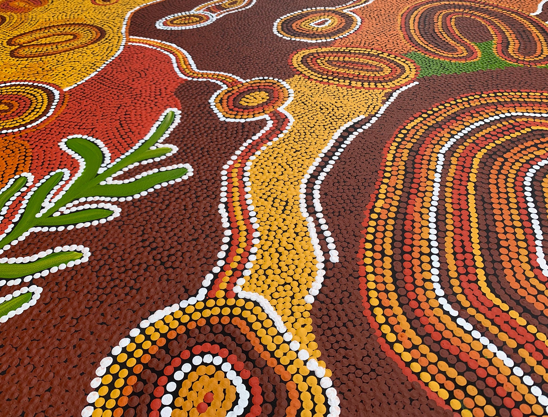 A powerful artwork honouring the stories, wisdom, and spiritual guidance passed down through generations of women. Dots, flowing lines, and concentric circles represent waterholes, travel paths, and gathering places central to Aboriginal family life.