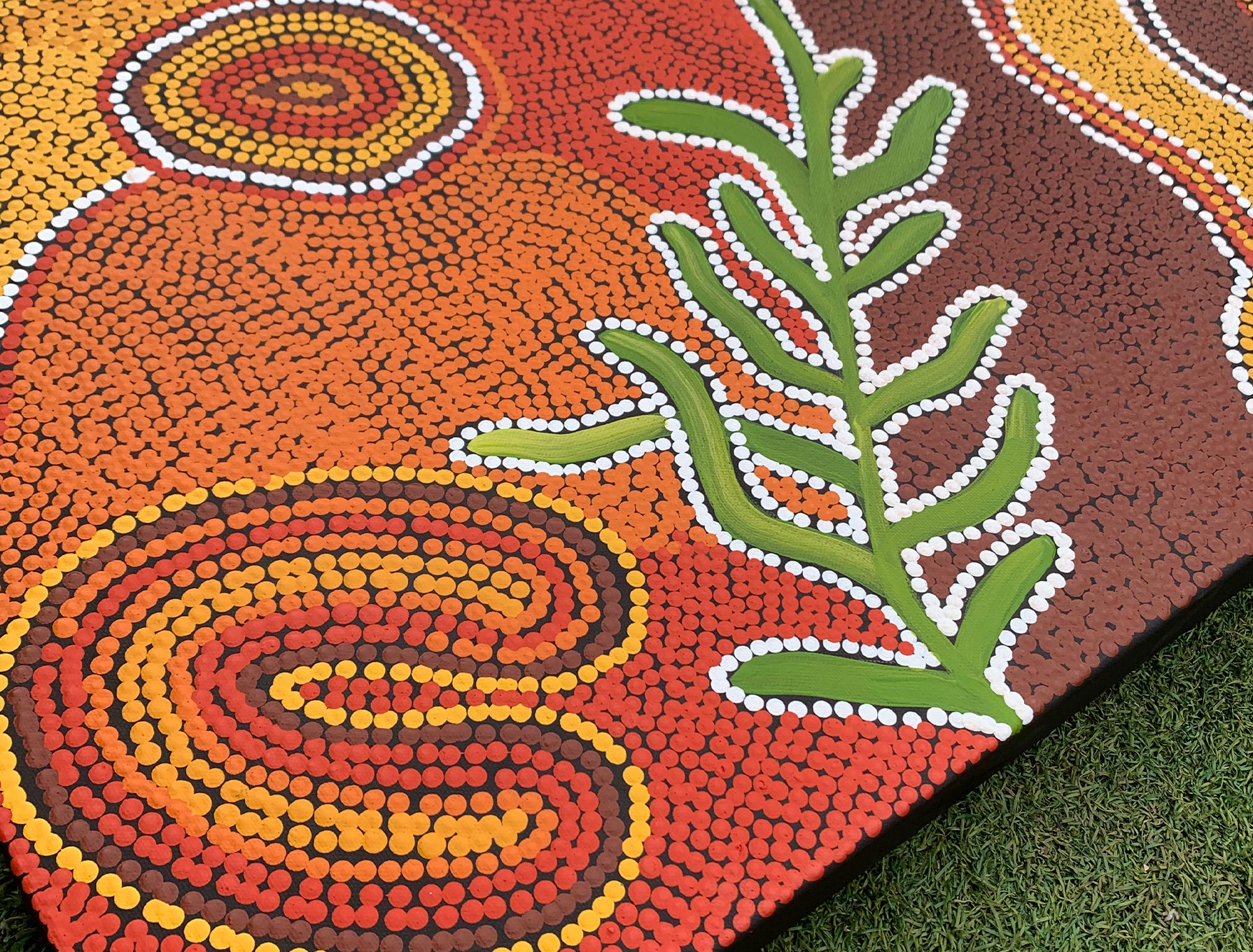 Kelly Taylor is an Aboriginal artist who belongs to the Yankunytjatjara/Pitjantjatjara people on her grandmother, Millie Lennon-Terone’s side, and the Kokatha people on her grandfather, Edgar Dingaman’s side. Her work celebrates heritage, storytelling, and connection to Country.